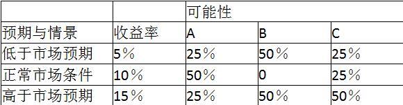 B、C三种不同金融产品。预期在不同市场条件下,三种产品可能产生的收益率分别为5%、10%、15%,产生不同收益率的可能性如表1—2所示。