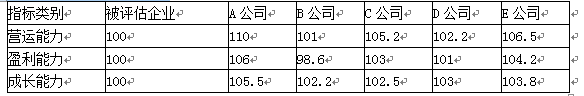 (3)根据H公司行业性质、企业资产构成与业务特点,确定价值比率为市净率P/B,并采用因素调整法对可比公司的价值比率进行调整。被评估企业和五家上市公司各因素评分情况如下: