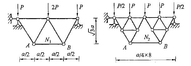 图示两桁架结构杆AB的内力分别记为N1和N2。则两者关系为: