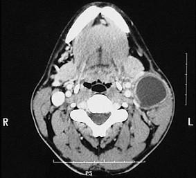 40岁女性,右上颈部包块发现5年,增长不明显。近3天发生上呼吸道感染,肿物突然增大,伴疼痛。检查见肿物位于胸锁乳突肌上1/3前缘,质软,有波动感,无搏动,体位试验阴性。CT 检查如图。最可能的诊断是 ( )