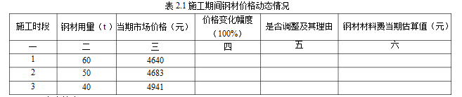 (1)计算并填入答题卡表 2.1“施工期间钢材价格动态情况”中各施工时段第四、五、六栏的内容;