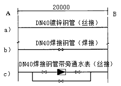 图示为三种同管径、不同材质管道的平面图。从起点A到终点B之间的距离为20m,计算图中三种情况的管道安装工程量。a)DN40镀锌钢管(丝接) b)DN40焊接钢管(焊接) c)DN40焊接钢管带旁通水表(丝接)