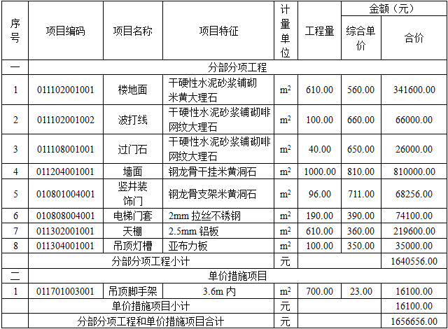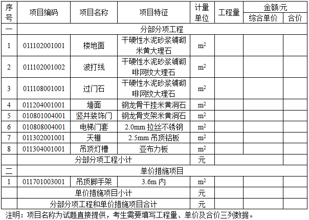 2.根据问题1的计算结果及合同文件中“分部分项工程和单价措施项目清单与计价表”的相关内容,按《建设工程工程量清单计价规范》(GB 50500—2013)的要求,在表4-76“分部分项工程和单价措施项目清单与计价表”中编制该土建装饰工程结算。 表4-76 分部分项工程和单价措施项目清单与计价表