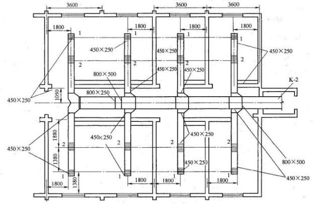 某空调系统的部分平面图如下图所示,根据图纸信息,指出主风道尺寸、支风道尺寸,以及中心距内墙的距离。
