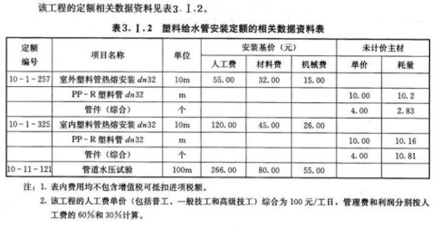 按照背景资料案例二中的相关数据和图2.I.1、2.I.2中所示要求,根据《通用安装工程工程量计算规范》GB 50856-2013、《建设工程工程量清单计价规范》GB50500-2013和《通用安装工程消耗量定额》TY 02-31-2015的规定,编制室内dn32 PP-R塑料给水管道分部分项工程量清单的综合单价,已知dn32 PP-R塑料给水管道的管子工程量为25m;并填入答题卡表3.I.1“综合单价分析表”中。(计算结果保留两位小数)![]()