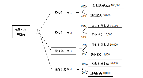 项目经理向客户推荐了四种供应商选择方案。每个方案损益值已标在下面的决策树上。根据预期收益值,应选择设备供应商 ( )