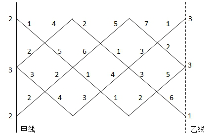 已知网络图各段路线所需费用如下图所示,图中甲线和乙线上的数宇分别代表相应点的有关费用。从甲线到乙线的最小费用为( ) 。