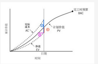 挣值管理是一种综合了范围、时间、成本绩效测量的方法,通过与计划完成的工作量、实际挣得的收益、实际的成本进行比较,可以确定成本进度是否按计划执行。下图中标号所标示的区间依次应填写 ( ) 。