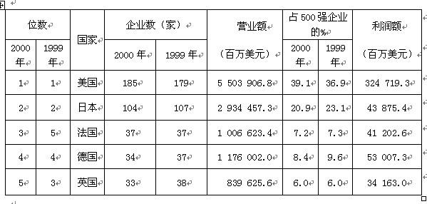 根据下面的统计表,回答问题2000年美国上榜企业的营业额及占500强营业总额的百分比比上年提高了多少个百分点?( )