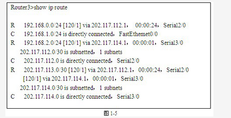 3.查看路由器Router3的路由表,结果如图1-5所示。