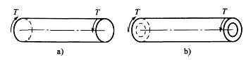 图示两根圆轴,横载面面积相同但分别为实心圆和空心圆。在相同的扭矩T作用下,两轴最大切应力的关系是: A. τab
