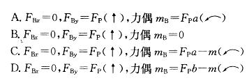 图示平面刚性直角曲杆的支承力、尺寸与荷载均已知,且Fpa>m。B处插入端约束的全部约束力各为:![]()