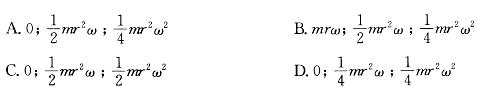 图示均质圆轮,质量为m,半径为r,在铅垂图面内绕通过圆轮中心O的水平轴以匀角速度ω转动。则系统动量、对中心O的动量矩、动能的大小为: