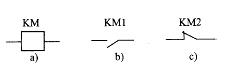 接触器的控制线圈如图a)所示,动合触点如图b)所示,动断触点如图c)所示,当有额定电压接入线圈后: