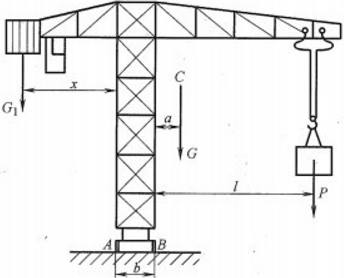 塔式起重机的结构简图如下图所示。设机架重力G=500kN,重心在C点,与右轨相距a=1.5m。最大起吊重量P=250kN,与右轨B最远距离1=10m。平衡物重力为G1,与左轨A相距x=6m,二轨相距b=3m。请根据背景资料解答下列各题。