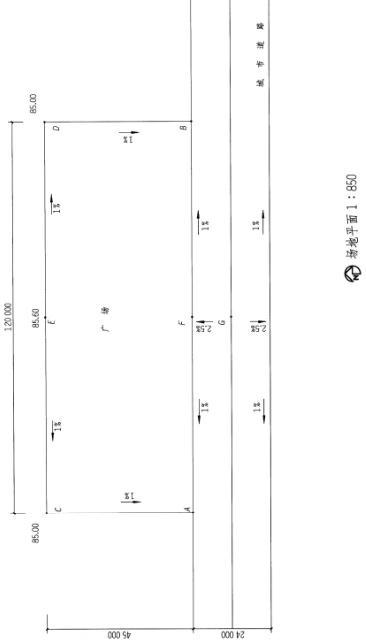 设计条件 1.下页图为一城市广场和城市道路关系图,道路路面宽24m,广场120m×45m。 2.广场坡度为1%,道路横坡坡度为2.5%,纵坡坡度为1%。 3.广场C、D、E点的高程分别为85.00、85.00、85.60。
