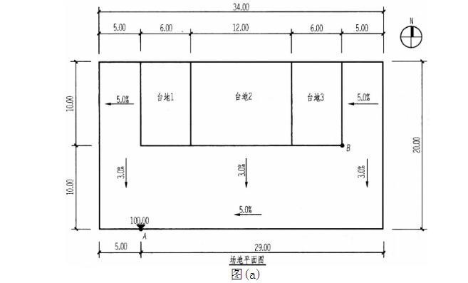 设计条件: ·某坡地上已平整出三块台地,如图(a)所示。 ·每块台地均高于相邻坡地,台地与相邻坡地的最小高差为 0.15m。 比例:1:200 单位:m![]()