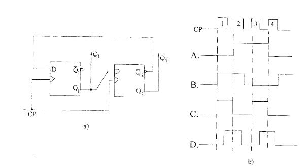 D触发器组成的电路如图a)所示。设Q1、Q2的初始态是0、0,已知CP脉冲波型,Q2的波形是图b)中哪个图形?