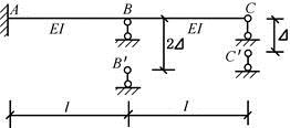 如图所示,两跨连续梁的中间支座B及右端支座C分别产生竖向沉陷2Δ及Δ,由此引起的截面A的弯矩MAB之值为( )。![]()