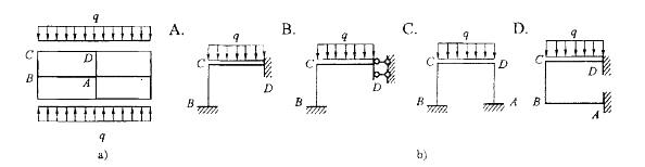 图a)为对称刚架,具有两根对称轴,利用对称性简化后,正确的计算简图为图b)四个图中的: