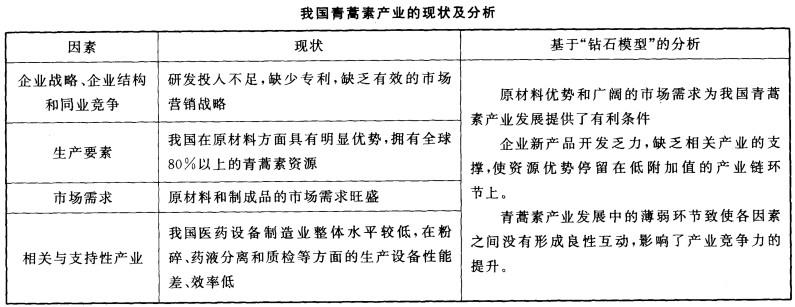【材料一】优势产业的培育,既与图中四种因素的基本状况密切相关,又与这些因素能否相互促进 有关。这一分析框架用图形表示如同钻石的顶面,因此被形象地称为“钻石模型”。【材料二】青蒿素是我国自主研发的治疗疟疾的药品,因其速效、高效而得到世界卫生组织的高度 评价,但是,受多种因素的影响,近年来我国青蒿素产业的发展遇到一些难题。