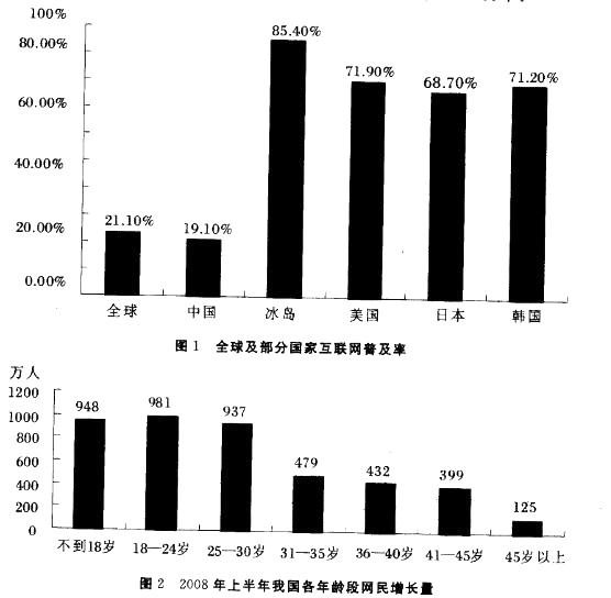 CNNIC于2008年7月发表的《第22次中国互联网络发展状况统计报告》显示,我国网民数达2. 53 亿,超美国居世界首位。尽管如此,我国互联网覆盖率只有19. 1%,仍低于21. 1%的全球平均水平。与上一年同期相比,我国网民人数增加了9100万,是历年来增长速度最快的一年,同比增长56.2%。仅2008年上半年,我国网民数净增就达4300万。统计表明,我国网站数量持续增长,截至2008年7月共有网站191. 9万个,同比增长率为46. 3% ;其中CN域名下的网站数为136. 9万个。