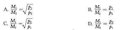 有两种理想气体,第一种的压强记作p1,体积记作V1,温度记作T1,总质量记作m1,摩尔质量记作M1;第二种的压强记作p2,体积记作V2,温度记作T2,总质量记作m2,摩尔质量记作M2;当V1=V2,T1=T2,m1=m2时,则M1/M1为:![]()