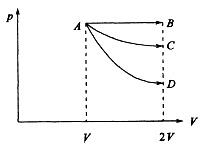 质量一定的理想气体,从状态A出发,分别经历等压、等温和绝热过程(A B、A C、A D),使其体积增加1倍。那么下列关于气体内能改变的叙述,哪一条是正确的?