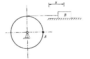 如图所示,绳子的一端绕在滑轮上,另一端与置于水平面上的物块B相连。若物B的运动方程为x=kt2,其中k为常数,轮子半径为R。则轮缘上A点加速度的大小为: