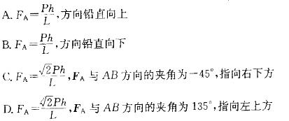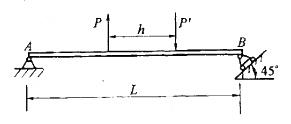 图示水平简支梁AB上,作用一对等值、反向、沿铅直向作用的力,其大小均为P,间距为h,梁的跨度为L,其自重不计。则支座A的反力FA 的大小和方向为:![]()