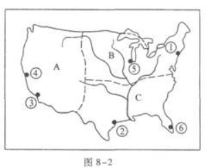 图8-2为美国本土工业分布图,关于该图的正确叙述( )
