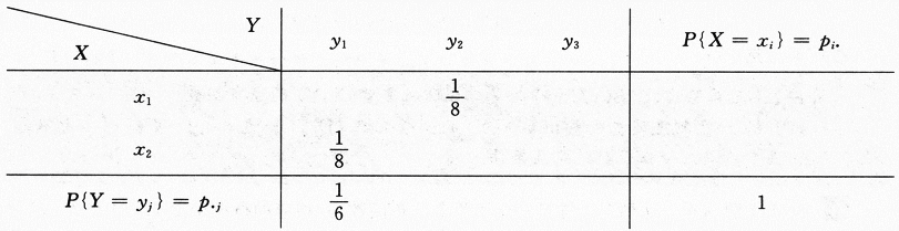 设随机变量X和Y相互独立,下表列出了二维随机变量(X,Y)的联合分布律及关于X和关于Y的边缘分布律中的部分数值.试将其余数值填入表中的空白处.