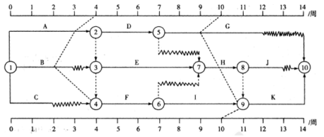 下图所示的双代号时标网络计划,执行到第4周末及第10周末时,检查其进度如图前锋线所示,检查结果表明( )。(2012)
