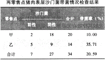 D甲乙两个副食品零售点均出售同一批发市场的猪肉。今检查两个零售点猪肉表层沙门菌带菌情况,结果见下表,分析两个零售点的沙门菌带菌率是否有差别,可采用什么统计分析方法