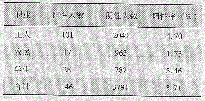 不同职业人群的表面抗原阳性率(%)三个阳性率比较的X