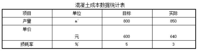 某机场工程的混凝土成本数据如下表所示。目标成本为504000元,实际成本为560320元,两者差额为56320元。