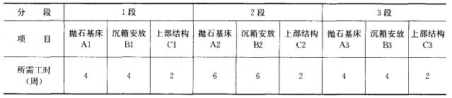某重力式码头主体工程施工分3个流水段进行,段间、段内施工工艺互无干扰。 抛石基床(包括挖泥、抛石、整平)、沉箱安放(包括预制、出运、安装、箱内填料)、上部结构(包括沉箱封顶混凝土、胸墙及面层混凝土浇筑)分项工程各只有一个专业施工队施工。各分项工程所需工时如下表所列。施工进度计划网络图如下: