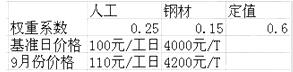 (2014年)某工程施工合同约定采用价格指数法调整合同价款,各项费用权重及价格如表所示。已知该工程9月份完成的工程合同价款为3000万元,则9月份合同价款调整金额为()万元。
