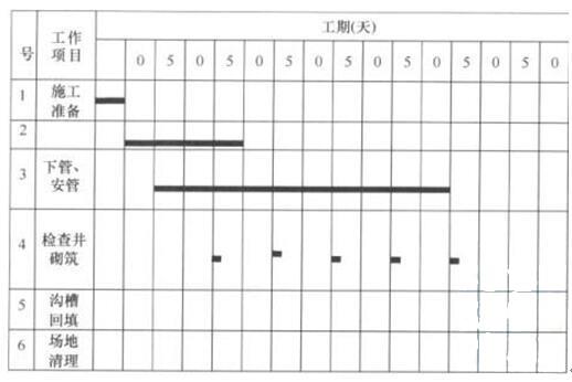 考虑管材进场的连续性和人力资源的合理安排,在编制进度计划时作了以下部署:①挖土5d后开始下管、安管工作;②下管、安管200m后砌筑检查井;③检查井砌筑后,按四个井段为一组(200m)对沟槽回填。项目部编制的施工进度计划如下(只给出部分内容):