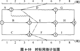 某工程双代号时标网络计划执行到第5周末时,实际进度前锋线如图4—10所示,从图中可以看出()。