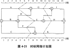 某工程双代号时标网络计划执行到第6周末和第11周末时,检查其实际进度如图4-21前锋线所示,检查结果表明()。