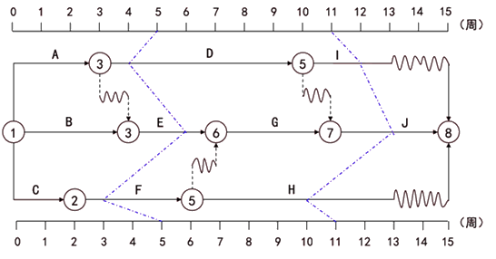 (2017年真题)某工程双代号时标网络计划执行到第5周和第11周时,检查其实际进度如下图前锋线所示,由图可以得出的正确结论有( )。
