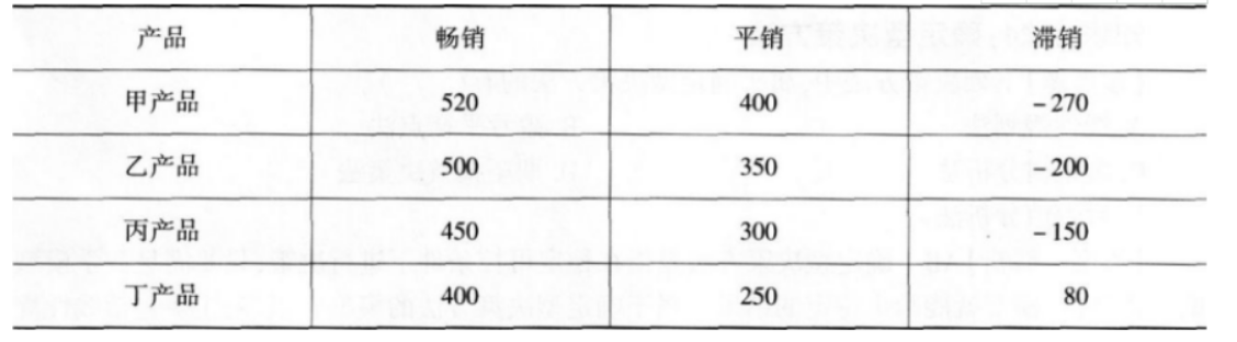 某洗衣机生产企业通过行业分析发现,洗衣机市场已经趋于饱和,销售额难以增长,行业内部竞争异常激烈,中小企业不断退出,行业由分散走向集中。该企业一方面加强内部成本控制,以低成本获得竞争优势;另一方面积极研发新型产品,推出具有特色的内衣洗衣机,受到消费者的青睐。与此同时,为了扩大企业利润,该企业积极进军手机行业,推出自主品牌的手机产品。新型手机产品方案共有甲产品、乙产品、丙产品和丁产品四种可供选择,每种产品方案均存在着畅销、平销、滞销三种市场状态,对应的市场状态及损益值见下表。