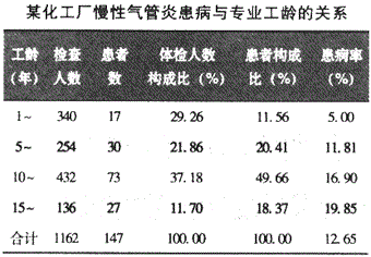 某化工厂对1162名工人的体检结果如下,试问哪一工龄组气管炎患病最严重。