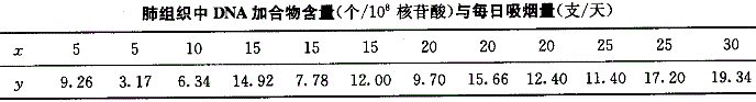 欲研究肺癌患者肺组织中的DNA加合物含量(个/10核苷酸)与吸烟的关系,某研究者用"同位素标记法"测定了12名肺癌患者肺组织中DNA加合物含量(y),并调查其每日吸烟量(χ),结果如下表: