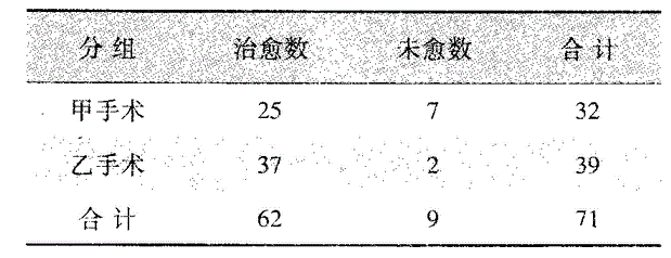 某医生比较两种不同手术治疗某病的疗效,共收治患者71例,结果如下表