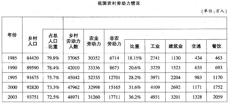 本题给出的资料是横标目有三级标目的表格,说明了1985年、1990年、1995年、2000年、2003年我国乡村人口、乡村劳动力人数、农业劳动力、非农劳动力等数据。