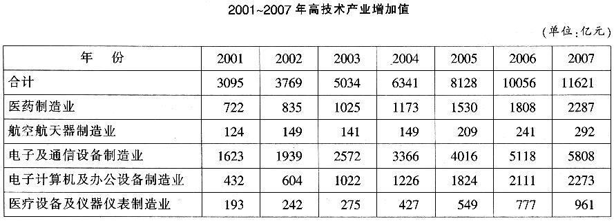 B2001—2007年。高科技产业各行业增加值均逐年递增