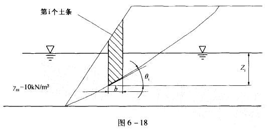 某土石坝坝址区设计烈度为8度,土石坝设计高度30m。计算简图如图6-18所示,采用瑞典圆弧法计算**坝坡的抗震稳定性,其中第i个滑动条块的宽度b=3.2m,该条块底面中点的切线与水平线夹角θi= 19. 3°,该条块内水位高出底面中点的距离Z=6m,条块底面中点孔隙水压力值u=100KPa,考虑地震作用影响后,第i个滑动条块沿底面的下滑力Si=415kN/m,当不计入孔隙水压力影响时。该土条底面的平均有效法向作用力为583kN/m,根据以上条件按照不考虑和考虑孔隙水压力影响两种工况条件分别计算得出第i个滑动条块的安全系数Ki( = Ri/Si)最接近( )。(土石坝填料凝聚力c=0,内摩擦角φ=42°)