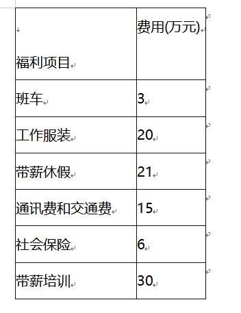 公司明年准备增加5万元带薪培训的投资,增加40万元的企业补充养老保险和4万元的医疗保险,并根据管理的要求,取消班车,发放车补10万元。